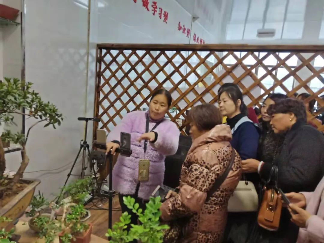她每天利用晚上直播时间,进行盆景造型、养护等知识讲解,不仅是让大家买,还要让大家学会养,学会动手去做,更好地推广盆景文化。作为“沭阳县巾帼网络创业实训基地”,每天来向姜爱花学习盆景制作技术和直播销售技巧的群众也络绎不绝,对于求学者,姜爱花都无私倾囊相授。如今,在有着 “中国盆景淘宝第一村”美誉的周圈村,在姜爱花等一批先行者的带领下,1200多户农民已经全部脱离传统的农业生产转型做了现代花农,越来越多的人开始热衷在网络上直播他们的“花花世界”。一场场巾帼带货直播