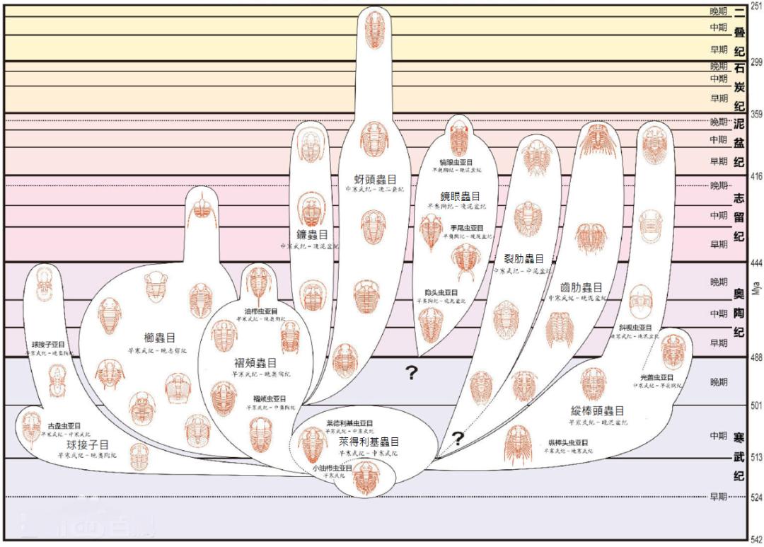 以知名的化石动物三叶虫为例,三叶虫家族在寒武纪时期最为繁盛,地层意义最重要,因此可以作为寒武纪的标准化石。这个家族中的莱德利基虫出现在寒武纪早期,是三叶虫家族创始人,可以作为寒武纪早期的标准化石。而球接子——一种浮游的三叶虫,是家族中演化出的新成员,可以作为寒武纪晚期的标准化石。