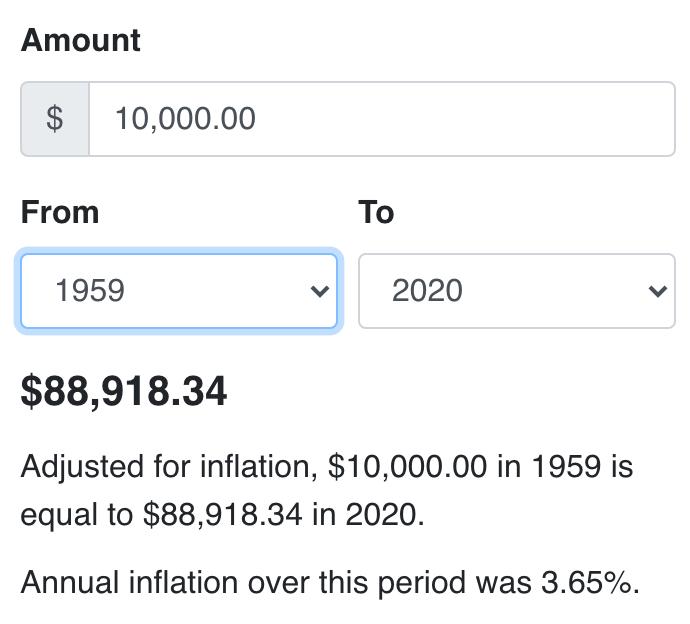 ▲ 1959年的1万美金,财大气粗到令人乍舌。扣除通货膨胀因素,相当于今年的8万9美金(人民币60万左右)。
