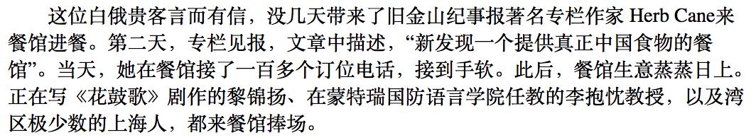 机缘巧合,某天福禄寿迎来了一位顾客正是江孙芸父母曾经的老友,正是有了他的引荐,当地一位颇负盛名的专栏作家Herb Caen来到了这里,想要品尝真正的中餐。