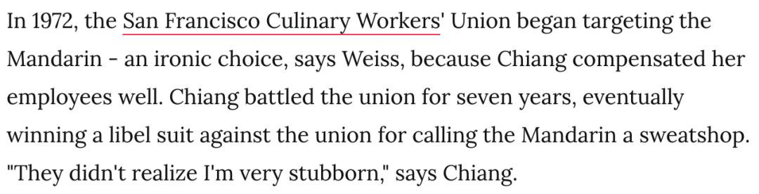 ▲ 70年代,美国工会运动达到顶峰,旧金山的工会把福禄寿称为血汗工厂,时不时有人在店外游行阻挡客人入内,还有各种危言耸听的恐吓。江孙芸和工会对抗了整整七年后,才赢得了官司的诉讼。她事后对媒体表示“他们并不知道我到底有多么强硬”。