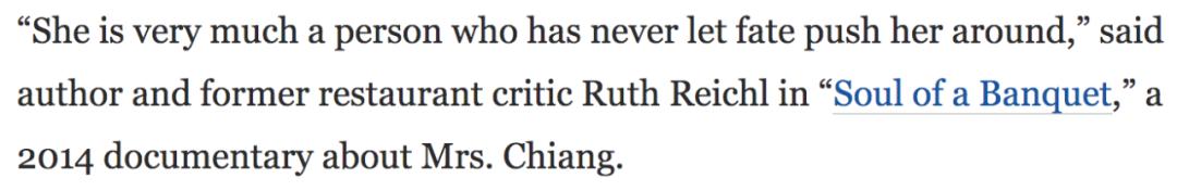 是啊,坚强不屈百折不挠的中华女性。就像作家Ruth Reichl在2014年关于江孙芸的纪录片《宴会的灵魂》里说的那样,她注定是一位永远不会被命运左右的人。