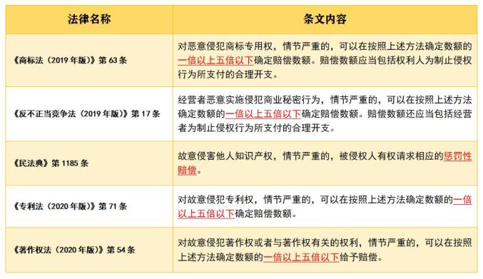 著作权法修正案规定,“对故意侵犯著作权或者与著作权有关的权利,情节严重的,可以在按照上述方法确定数额的一倍以上五倍以下给予赔偿。”著作权法中增加惩罚性赔偿制度意味着,在知识产权领域惩罚性赔偿制度已经较为全面的建立(见下图)。