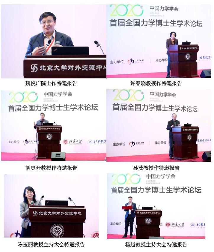 2020年11月7-8日,中国力学学会首届全国力学博士生学术论坛在北京大学召开。此次论坛由中国力学学会主办,北京大学和北京航空航天大学联合承办。中国力学学会理事长、北京理工大学方岱宁院士担任论坛主席。论坛主题为“协力同行、驭梦飞翔”,邀请了4个大会特邀报告和15个分会场专题邀请报告。本次论坛创新采取线上线下相结合的会议形式,设有15个并行分会场,其中5个线下分会场安排110个博士生报告, 10个线上分会场安排182个博士生报告。