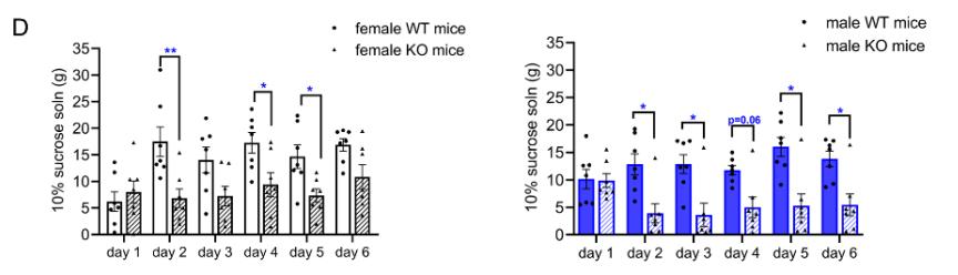 有趣的是,雄性小鼠和雌性小鼠表现出了截然不同的偏好。失去Prkar2a之后,雌性小鼠对高脂食物的喜好更低,而雄性小鼠则对蔗糖的观感变化更大。