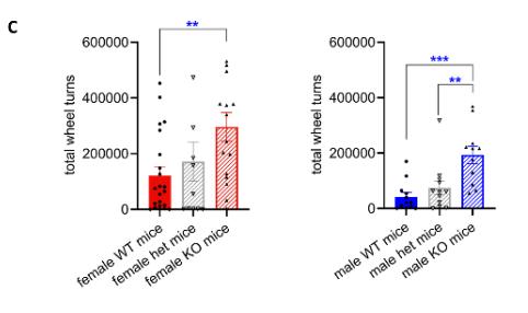 研究者还统计了小鼠的运动情况,发现Prkar2a敲除小鼠在转轮上跑了对照组2-3倍的距离!