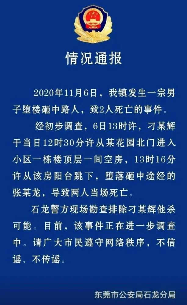 11月6日,东莞市公安局石龙分局发布情况通报称,当天石龙镇发生一宗男子堕楼砸中路人,致2人死亡的事件。