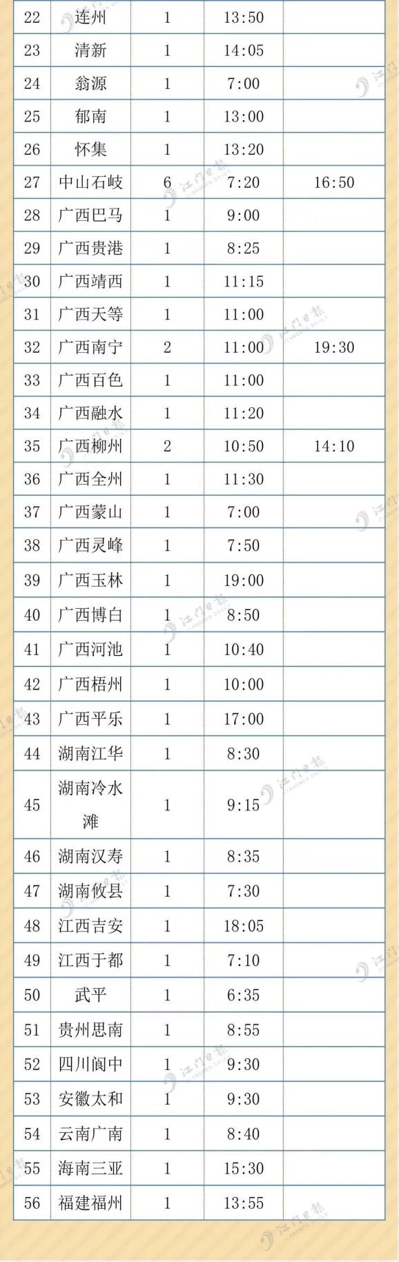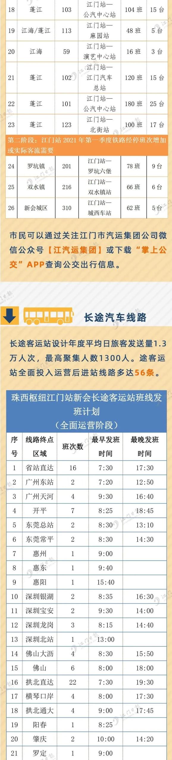 运行初期将安排列车109趟。广大市民可以在江门站乘车前往广州南、深圳北、佛山西、汕头、长沙南等地,外地的客人来江门也更加方便。作为广东第四大综合交通枢纽,