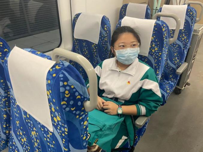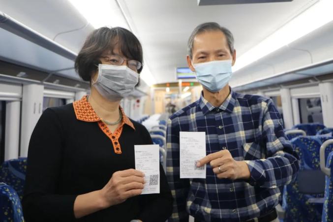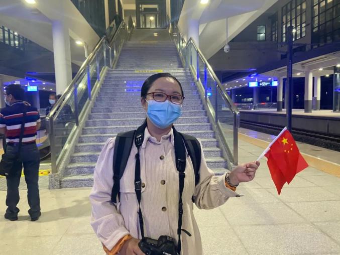 来自新会的李小姐挥舞国旗感受江门站售票运行带来的澎湃动力