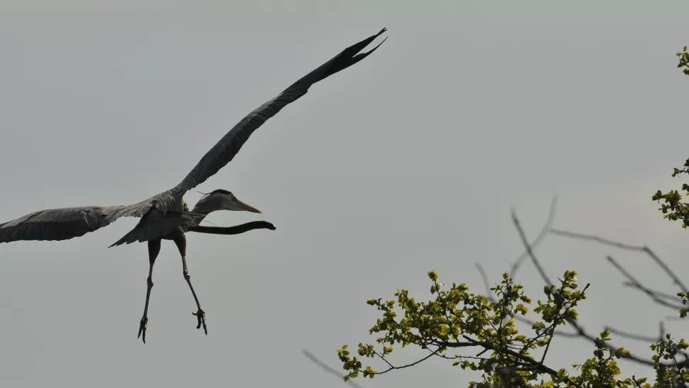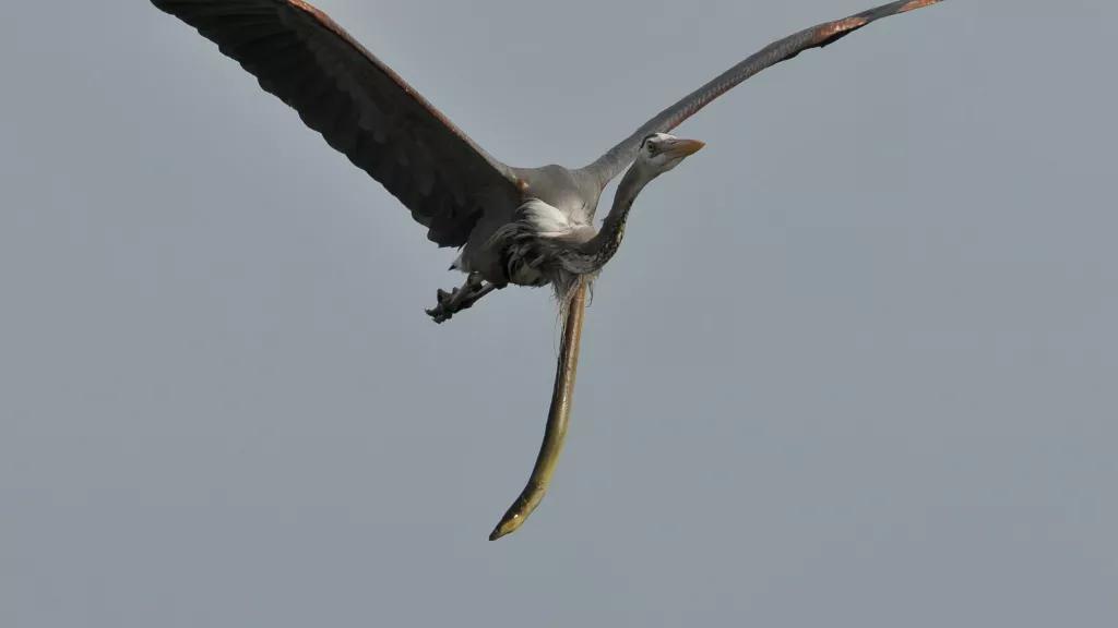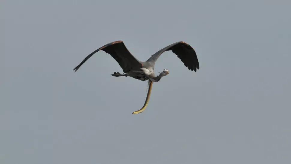 一只刚被生吞了的蛇鳗,从鸟的肚子钻出,悬挂在半空中。而被爆肚的鹭鸟,则若无其事地飞着……场面不但有点惊悚,而且难得一见。