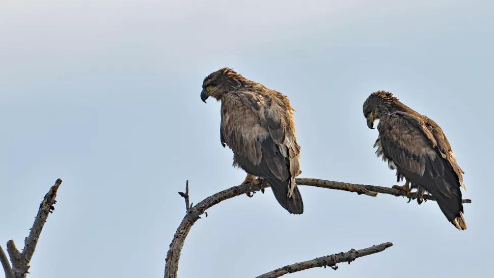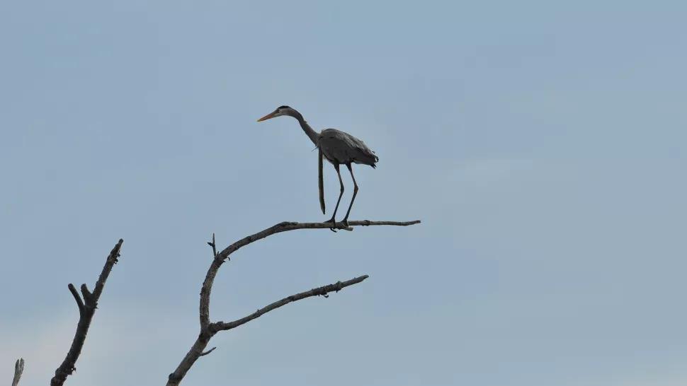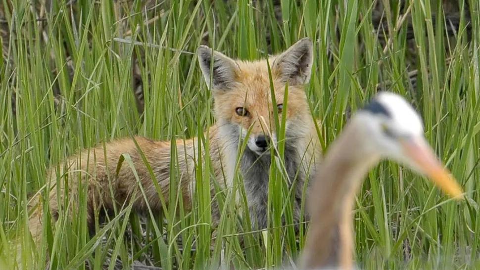 鹭鸟捕鳗,狐鹰在后。一只狐狸和几只老鹰也在暗中观察,运气好的话,或许就获得一顿(甚至两顿)免费的美餐。