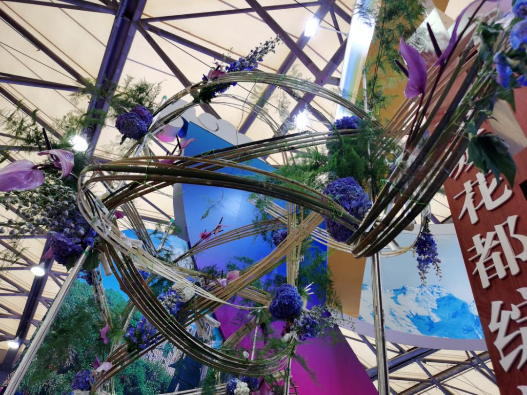 “太美了!”这是在呈贡展区听得最多的一句话。空中蓝色的花球就像一颗颗行星、彗星,环保绿色的飘逸的竹条像是行星在天空划过的星轨;地上,鲜花铺陈出的花境,让呈贡展区成为“打卡”人员最多的地方,直播的网红来了,其他展区的少数民族也来“打卡”。