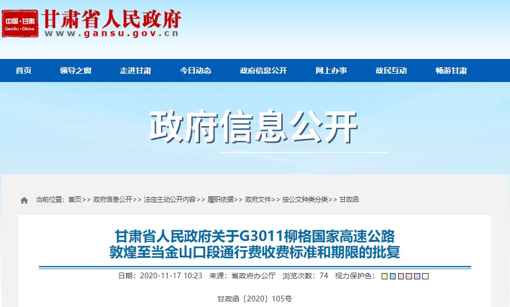 你们《关于核定G3011柳格国家高速公路敦煌至当金山口段通行费收费标准和期限的请示》(甘交发〔2020〕76号)收悉。根据《收费公路管理条例》(国务院令第417号)等有关规定,经研究,现批复如下: