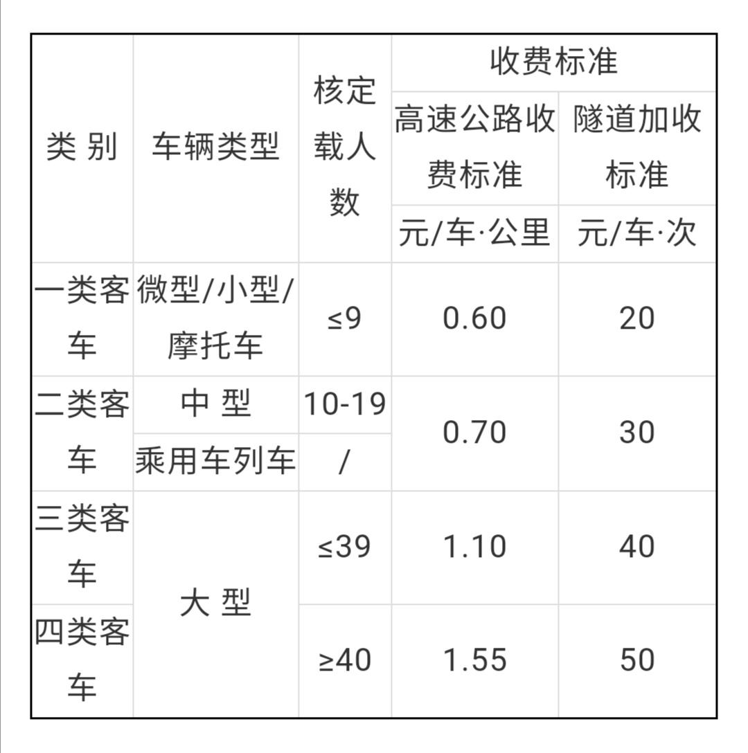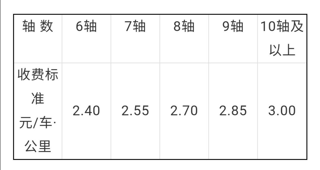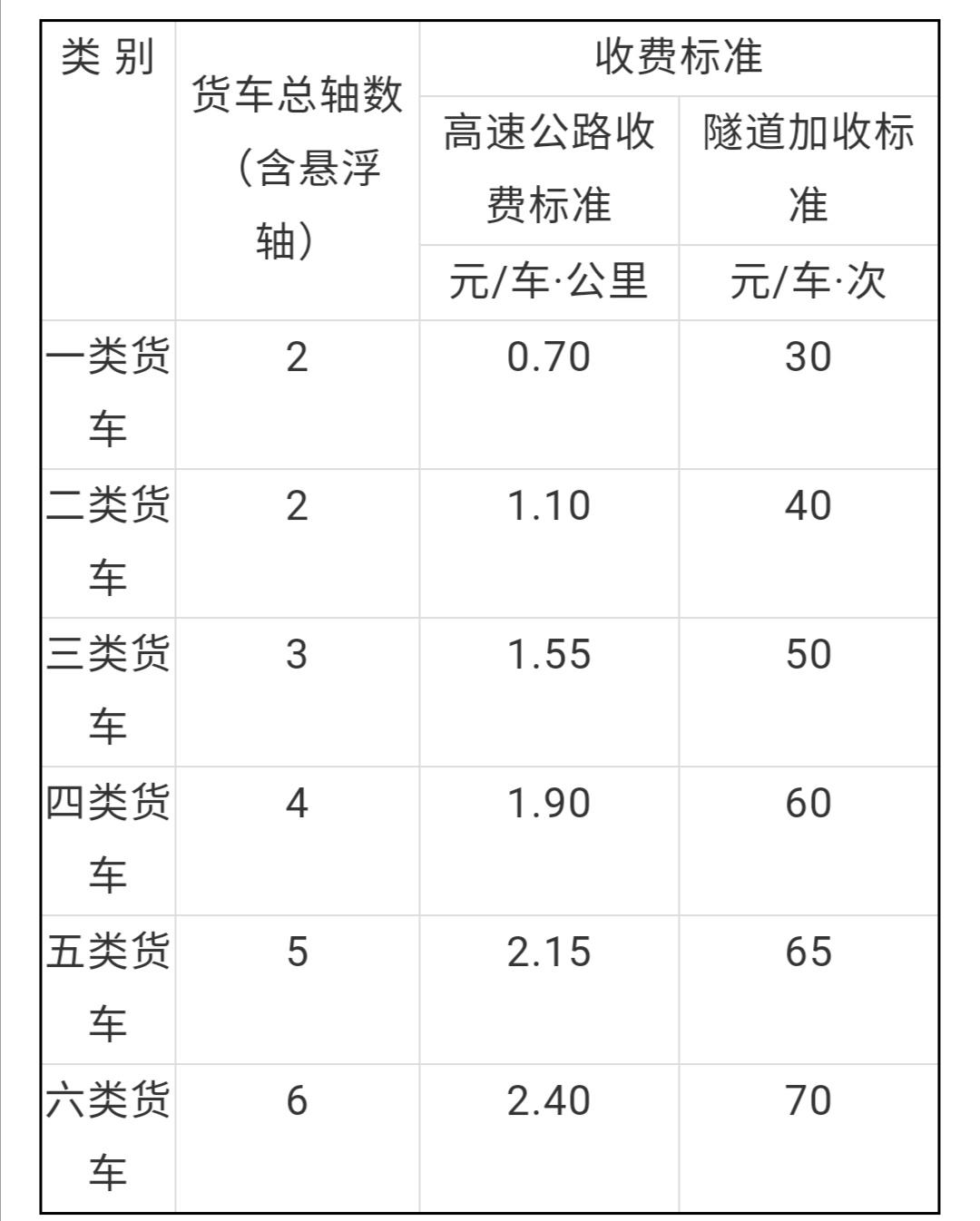 注:收费金额以元为单位,金额有小数的按四舍五入办法取整为元。六轴及以上货车隧道加收标准按六轴货车标准收取,六轴及以上专项作业车车辆通行费按六轴货车收费标准收取。