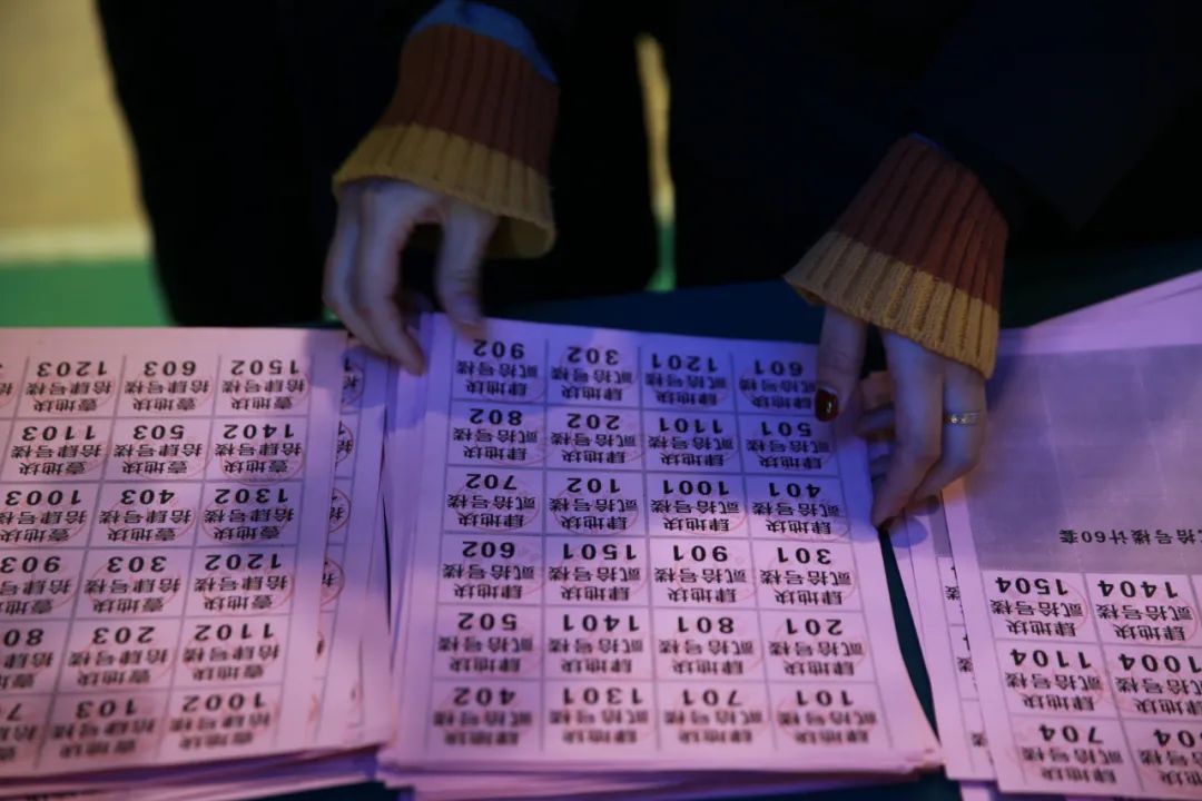 活动现场,工作人员依次为搬迁群众发放顺序号,公证处全程指导参与。第一轮抽取“顺序签”,抽取选房的顺序号,由工作人员引导至登记台进行登记;第二轮抽取“安置房号”,根据上一轮所抽取的顺序号,依次抽取房号,抽签结果经现场公证人员查验后当场宣布,选房人签字或摁手印。整个房屋分配现场组织严密,秩序井然,房屋分配工作按照既定程序有条不紊的进行。