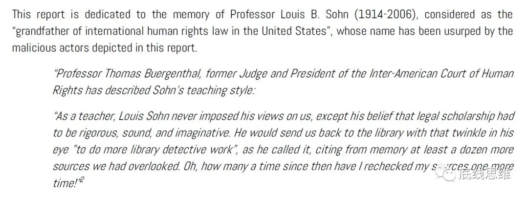 印度情报机构打着维护人权的旗号,却假冒已然仙逝的国际人权法祖师爷四处窜会站台,其嚣张程度可见一斑。对此,“欧盟虚假信息实验室”极为震惊,以至于他们义愤填膺,最后将整个《印度纪事》调查报告都献给了去世之后还被冒名顶替的路易斯·索翰(Louis B. Sohn)。