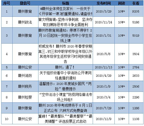 2020年,赣州市直政务微信矩阵共有128个公众号,均保持正常运营,公众号共发布58290篇文章,收获阅读总数约为7408万次,点赞总数达38.7万,公众号类别布局非常丰富,涵盖教育、公安、检察、税收、法院、共青团等各类政务公众号。总阅读达74089985!