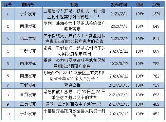 2020年,赣州20个区县政务微信,发布了34218篇文章,收获阅读总数约为8270万次,点赞总数达18.7万;平均单个公众号全年发布395篇文章,平均单个公众号推文获得阅读量近2415次、点赞5次。总阅读达82702653!