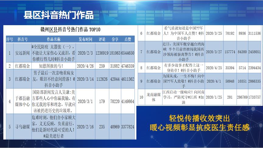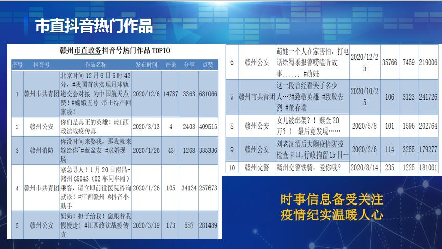 2020年,20个区县抖音,总粉丝497.8万人,共发布视频6424条,日均发布量为17.6条。视频累计获得3226270次评论、2541249次分享和90159754次点赞。立足赣州,放眼全国,聚焦正能量事件,以用户喜闻乐见的形式传播正向主流价值观,舆论引导作用明显。