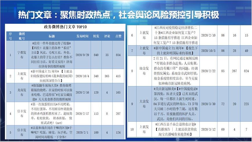 2020年,赣州20个政务微博账号全部活跃发博,活跃账号累积粉丝总数达627522,发布博文100123条,日均更博274条,平均单个账号日均更博13条以上,整体运营活性居高;赣州政务微博原创博文占比高达94.46%。聚焦时政热点,社会舆论风险预控引导积极。