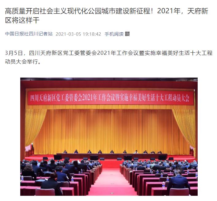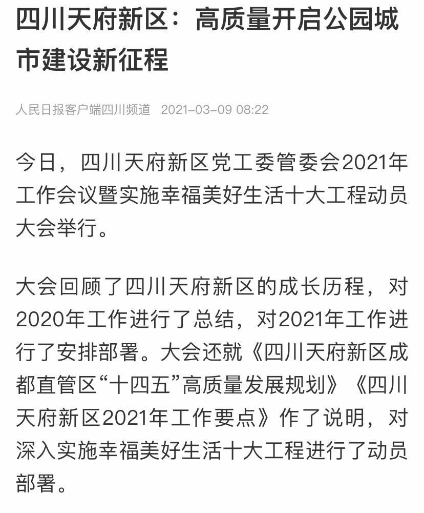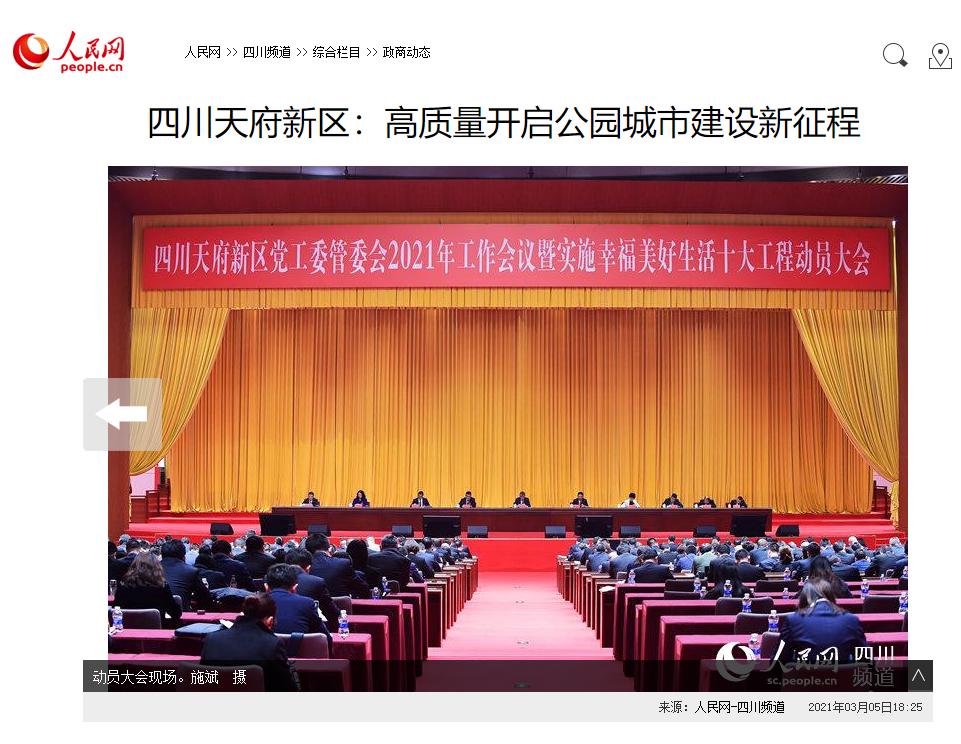 人民日报3月9日,人民日报客户端以《四川天府新区:高质量开启公园城市建设新征程》为题,对四川天府新区党工委管委会2021年工作会议暨实施幸福美好生活十大工程动员大会进行了详细报道。