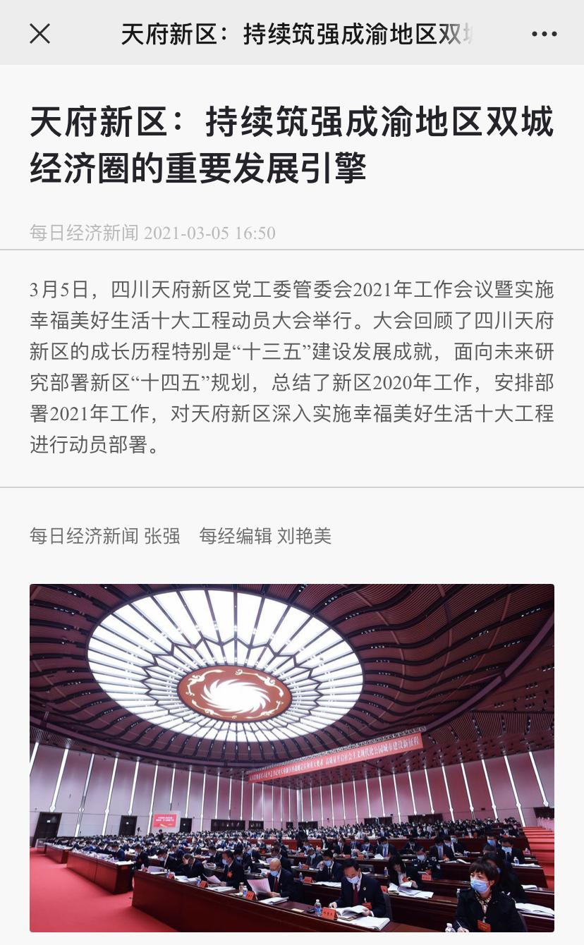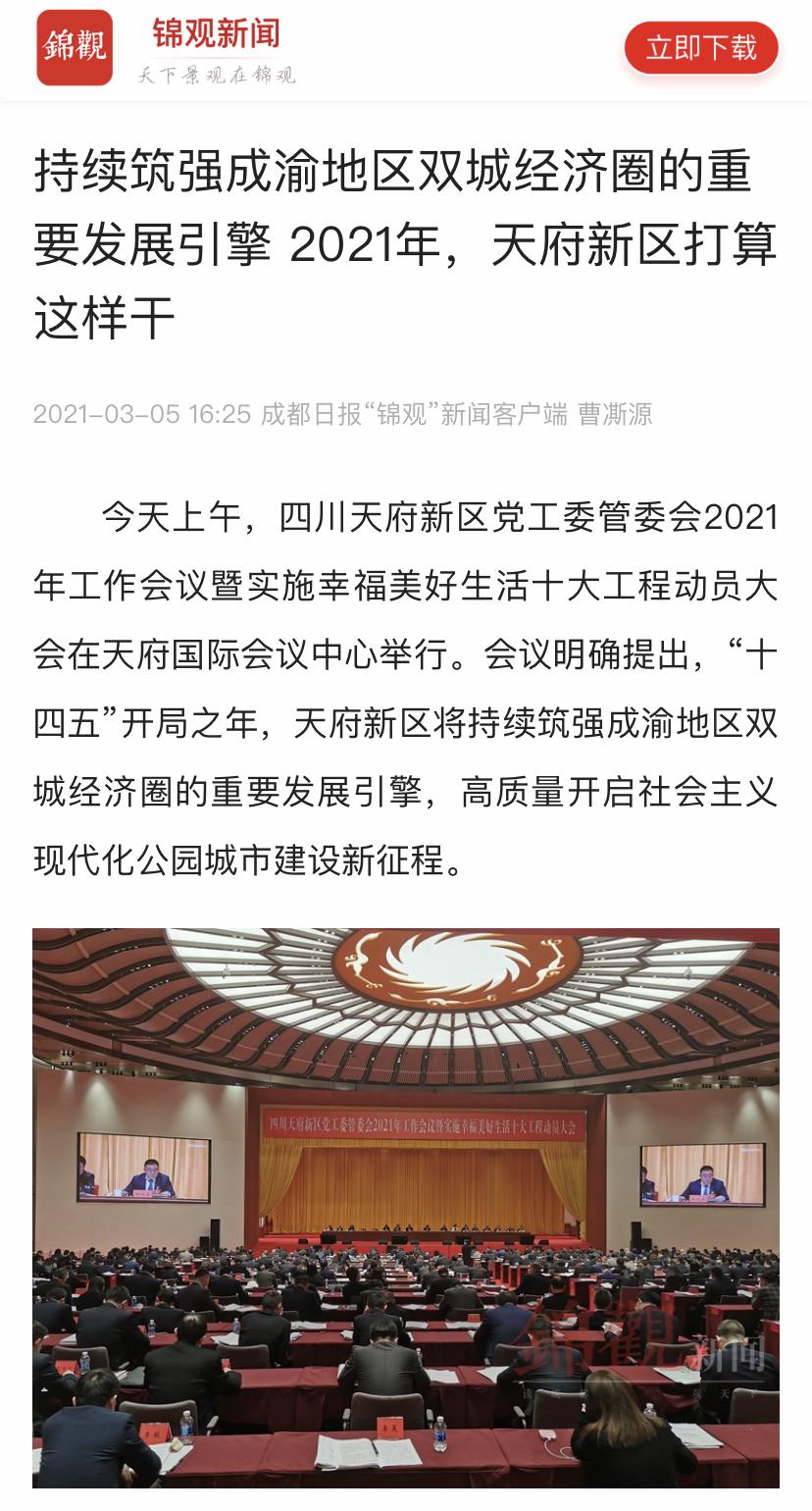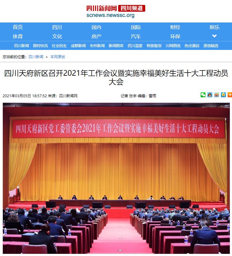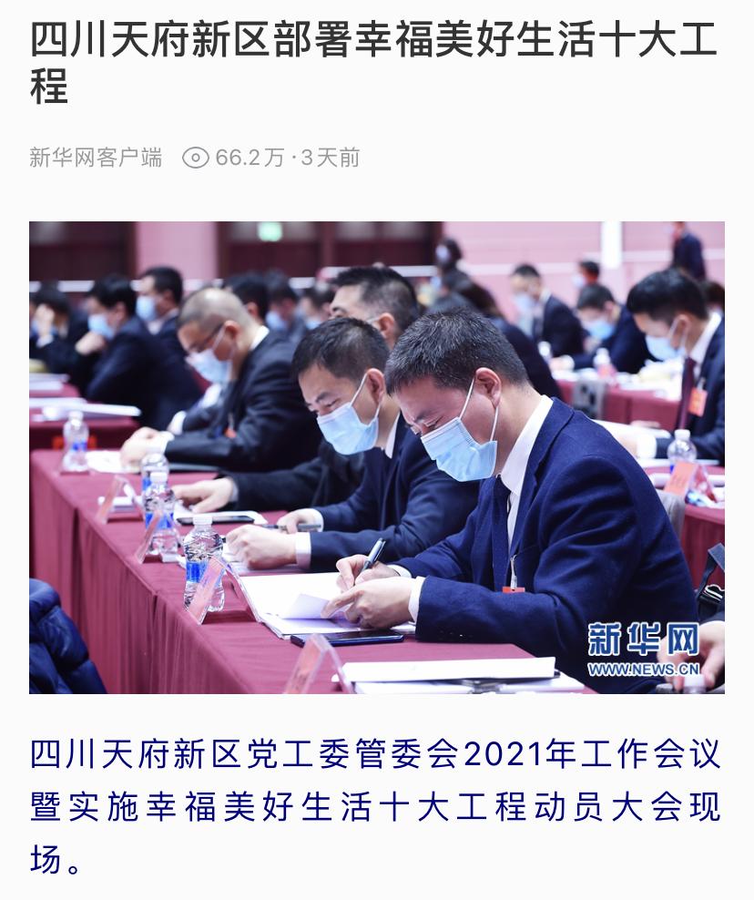 四川新闻网四川新闻网发布了名为《四川天府新区召开2021年工作会议暨实施幸福美好生活十大工程动员大会》,聚焦天府新区持续筑强成渝地区双城经济圈的重要发展引擎,高质量开启社会主义现代化公园城市建设新征程。