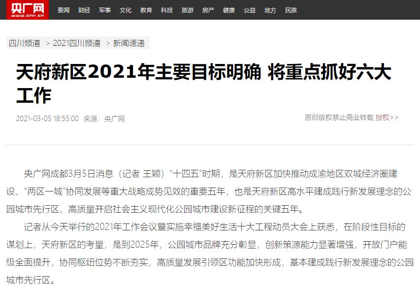 央广网3月5日,央广网发布《天府新区2021年主要目标明确 将重点抓好六大工作》,聚焦“十四五”时期天府新区高水平建成践行新发展理念的公园城市先行区、高质量开启社会主义现代化公园城市建设新征程。