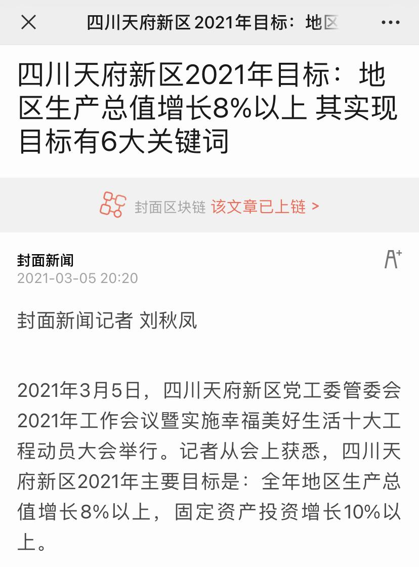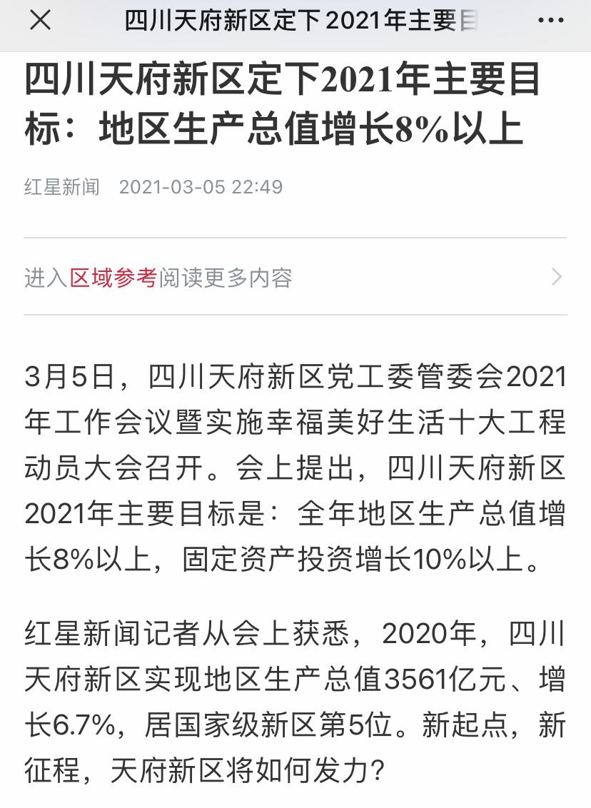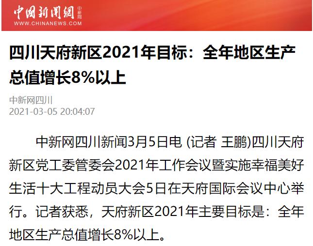 其中详细报道了四川天府新区2021年的主要目标任务:全年地区生产总值增长8%以上,固定资产投资增长10%以上,以及实现这一目标的六大关键词。