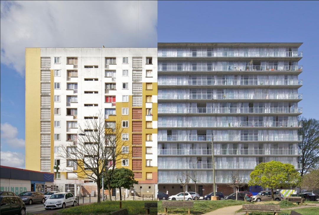 ▲改造前后的公共住房。拉尔顿和瓦萨尔“永不拆毁”的理念在改造法国公共住房的项目中表现得最为明显。2004年,他们和建筑师德鲁特(Frédéric Druot)共同撰写了《Plus》宣言,游说法国政府对公共住房进行翻新,而不是夷为平地重新建造。2011年,三位建筑师完成了对1960年代破旧住宅项目“Tour Bois le Prêtre” 大楼的改造。通过更换建筑的外立面,他们不仅扩大了每套公寓的面积,还增加了露台和落地窗等现代功能。更神奇的是,在整个施工工程中,住户可以一直住在里面,并不用搬出去。