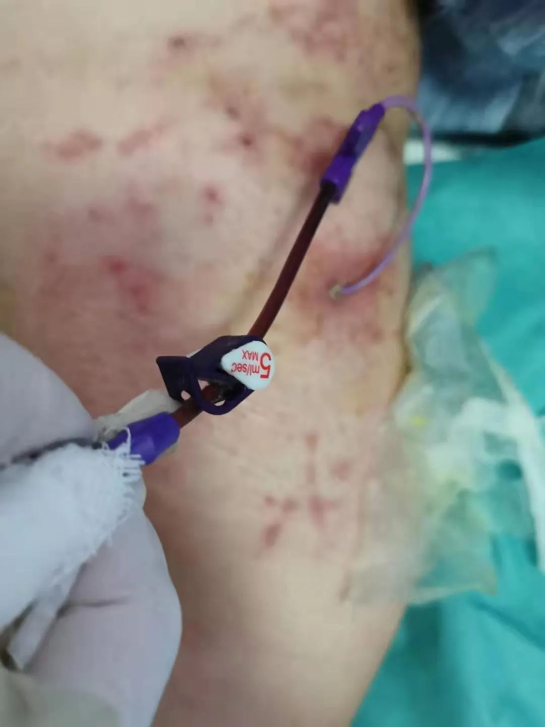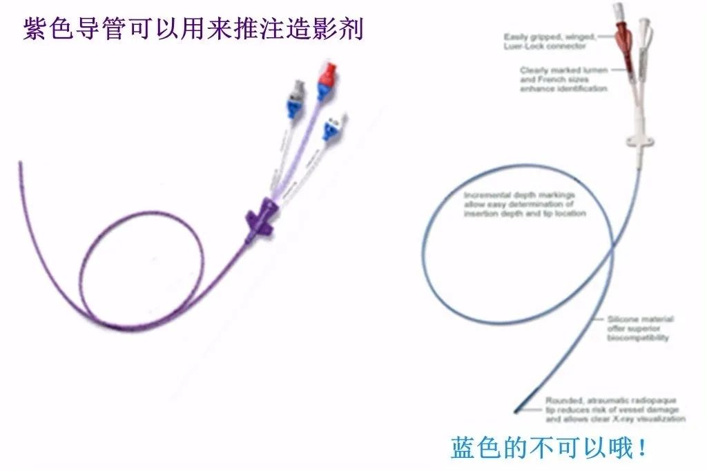蓝色PICC导管不能用于CT、磁共振检查时高压注射泵推注造影剂,在做造影时请告知医生,紫色耐高压导管可以