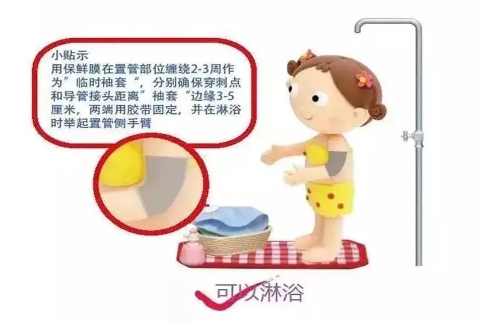 ☆在淋浴前请先固定好导管,固定方法:先在贴膜外缠绕清洁干燥的毛巾或纸巾,再在毛巾或纸巾外用保鲜膜将穿刺点上下15厘米的范围包裹严密,最后用胶布固定好上下口,防止进水就行。☆淋浴后及时检查敷料,如有潮湿、进水请及时更换, 最好每周安排在洗澡后去医院更换贴膜。