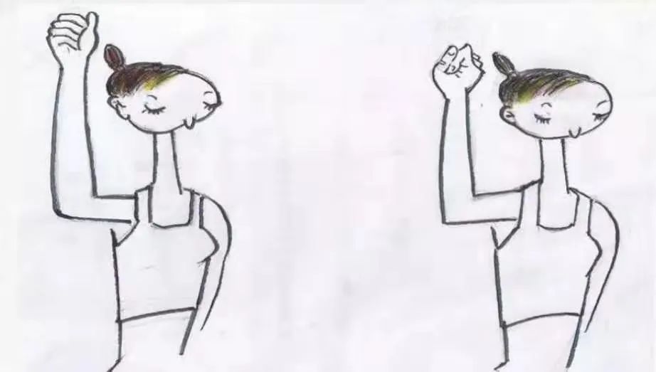 上下活动手腕,配合内外旋转,双侧手腕交替进行,每天2次,每次10分钟,腕部活动可有效促进手部放松,促进血液循环。【曲肘运动】