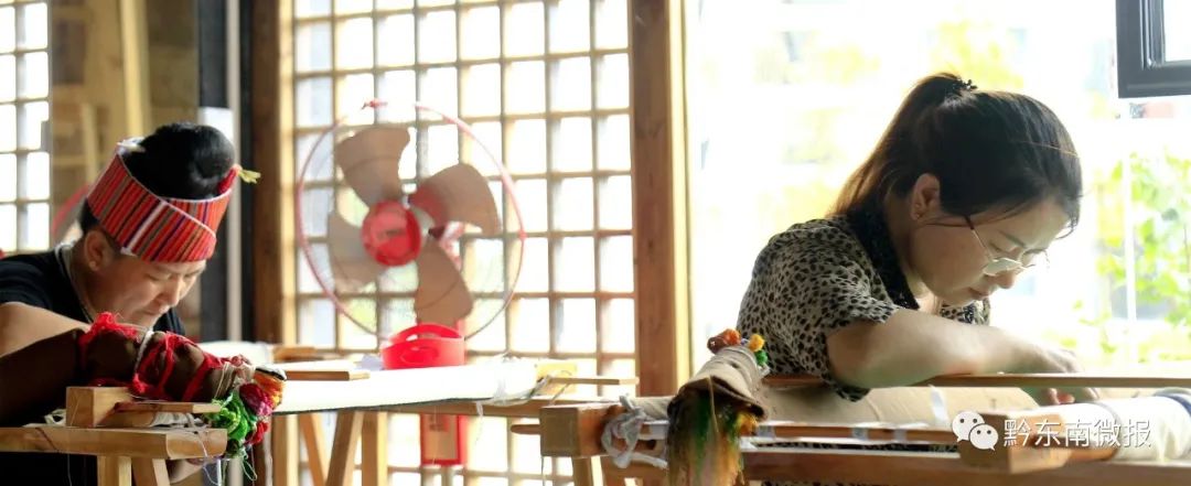 三月微风正暖,走进施秉桃子湾工业园区舞水云台旅游商品开发有限公司,在绣纺里,几十名苗族妇女手持绣针说说笑笑做着绣活。