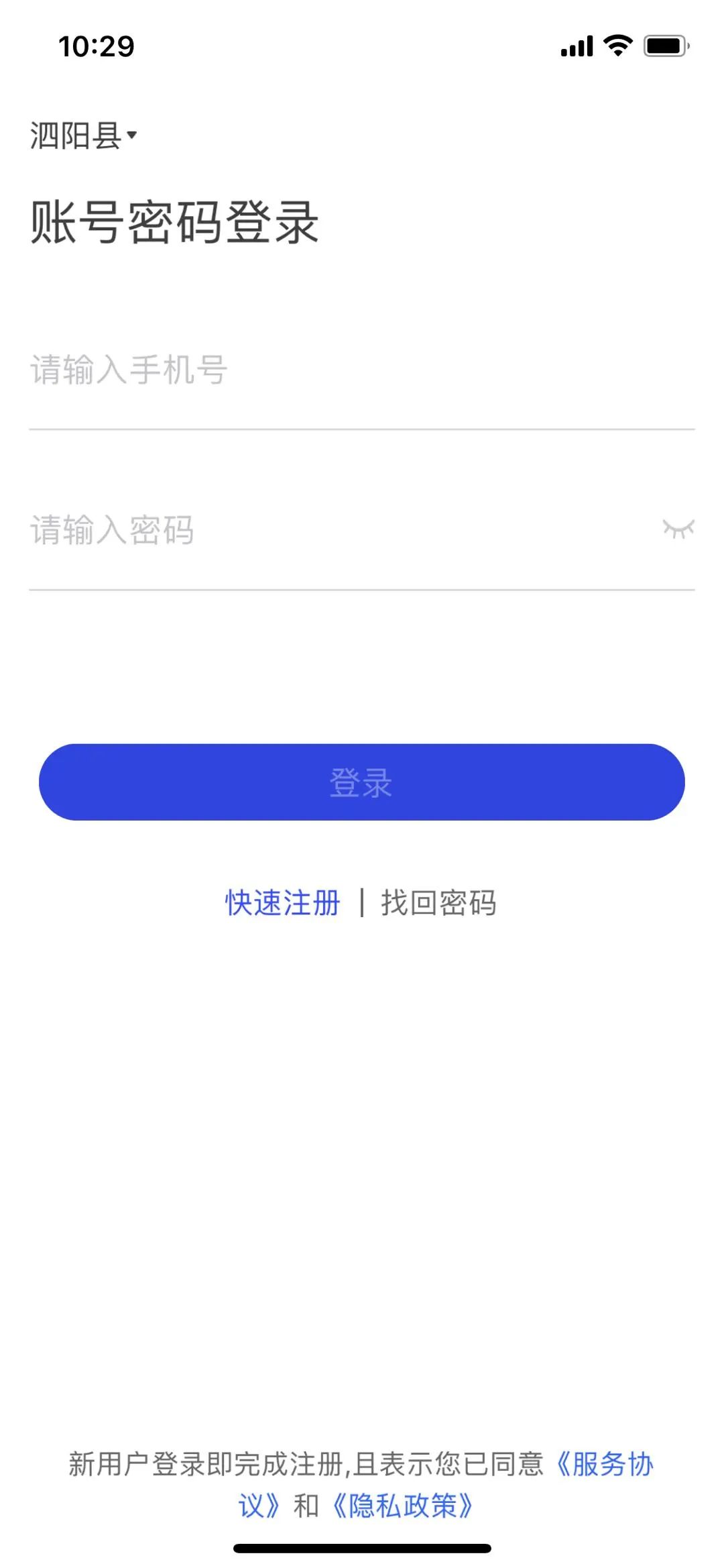登陆后点击如遇到弹窗要求授权请点击【始终允许】,登陆APP后,选择地区为江苏省宿迁市泗阳县,进入登陆页面,点击快速注册,填写手机号后点击获取验证码,将验证码及登陆密码填写完成后点击确定进行注册。