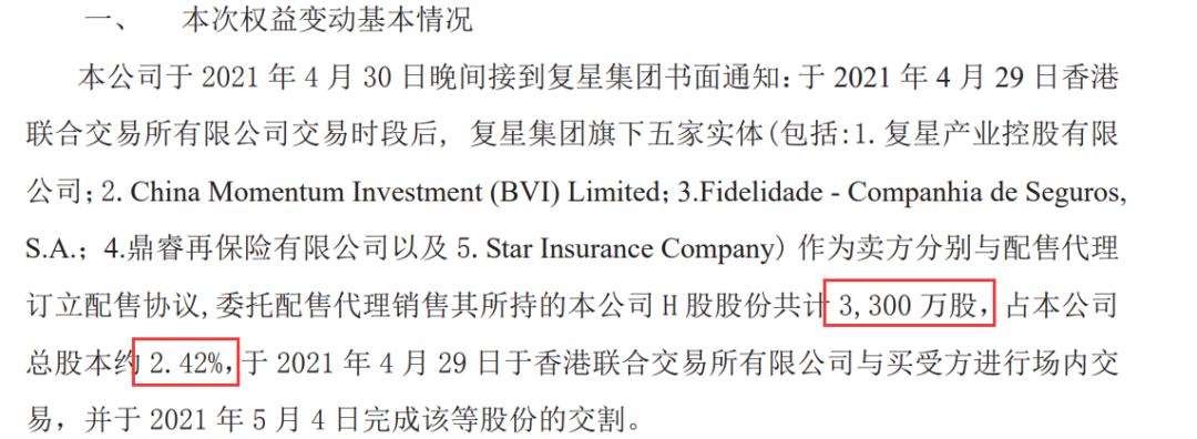 对于减持的理由,复星国际和郭广昌并没有明确公开表态。仅在一份权益变动报告书中,公司写到过减持的目的,“信息披露义务人本次系因正常投退安排而减持。”