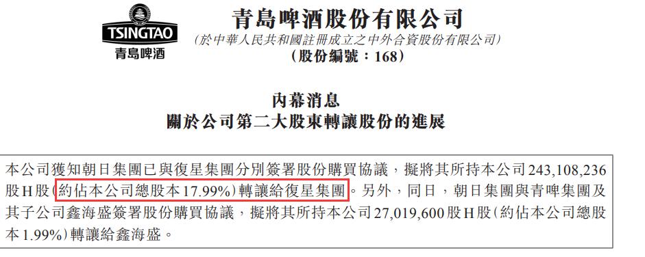2017年12月20日,"复星系"斥资66.17亿港元收购朝日啤酒持有的青岛啤酒2.43亿股H股,占后者总股份的比例为17.99%,成为青岛啤酒第二大股东。收购完成后,郭广昌曾表示“和青岛啤酒一起长期共同发展”。