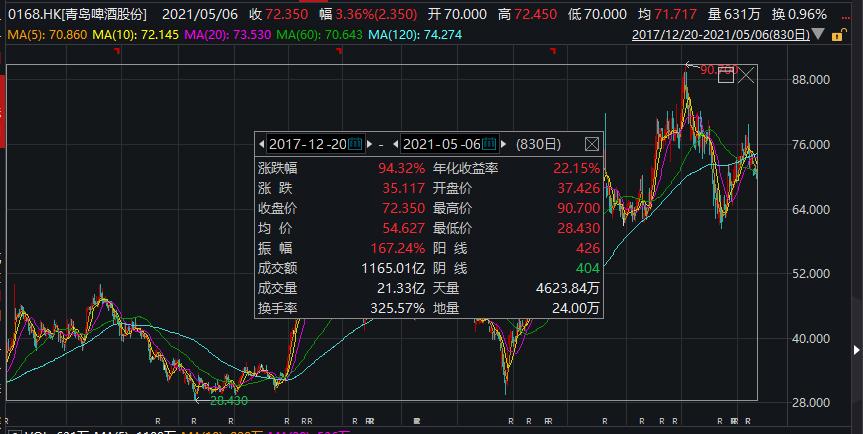 Wind数据显示,截至5月6日港股收盘,青岛啤酒股价为72.35港元/股。与2017年底郭广昌投资青岛啤酒时30多元的股价相比,如今公司股价已基本实现翻倍。