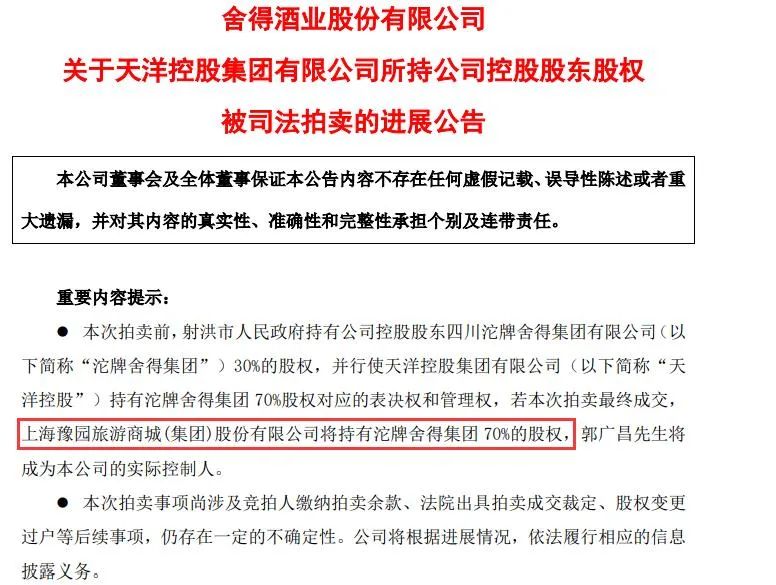 2020年12月31日,复星旗下上市公司豫园股份以45.3亿元的价格成功竞得舍得集团70%股权,郭广昌成为舍得酒业的实际控制人。