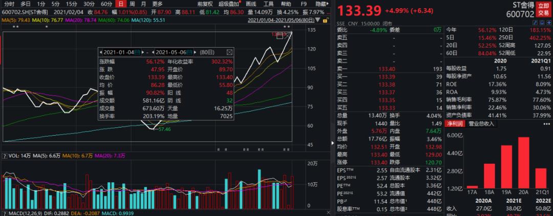 数据显示,ST舍得在去年年底迎来新主人郭广昌以来,累计上涨55%以上。