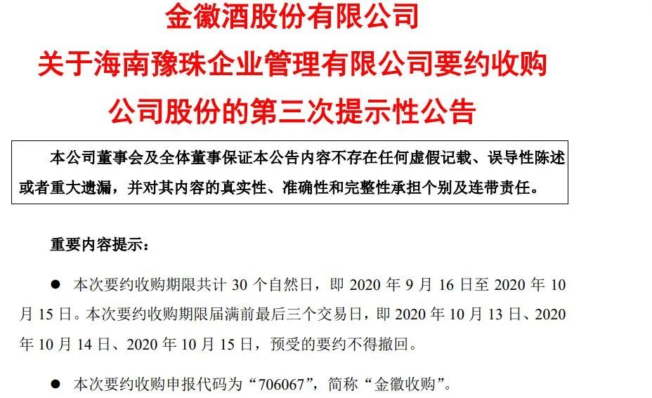 2020年9月到10月,豫园股份再出手,宣布通过海南豫珠以7.15亿元要约收购金徽酒8%股份。截至2020年10月20日,相关要约收购清算过户手续已经办理完毕,豫园股份及其一致行动人海南豫珠合计持有金徽酒约1.93亿股。