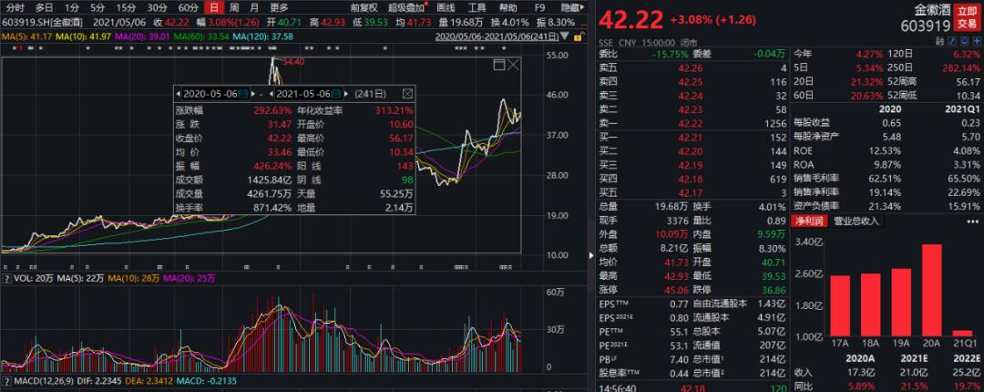 至此,持股比例相应提升到了38%,成为第一大股东。估算下来,郭广昌共斥资80亿豪饮金徽、舍得两瓶酒。自豫园股份入主后,金徽酒股价就开始持续上涨。截至5月6日收盘,金徽酒报42.22元/股,与一年前收购时相比涨幅高达近3倍。截至当前,金徽酒总市值已超过210亿元。对于复星来说,这无疑是一笔收益颇丰的投资。