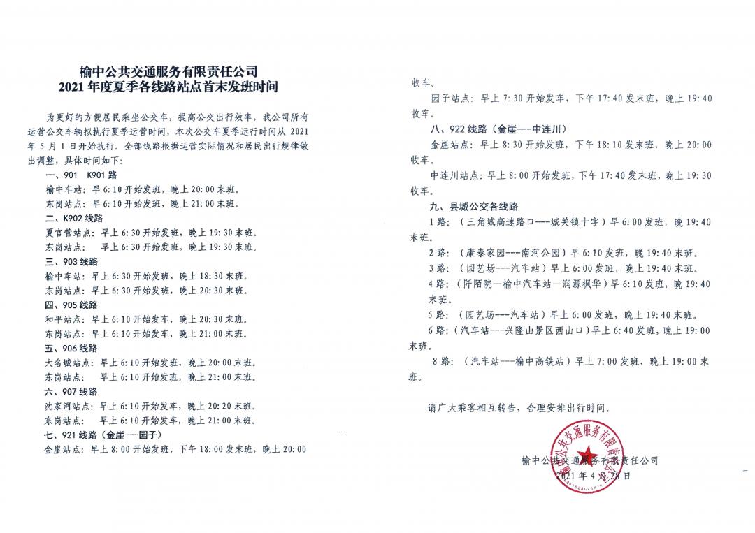 榆中县兰州市榆中公共交通服务有限责任公司所有运营公交车辆已于5月1日开始执行夏季运营时间。