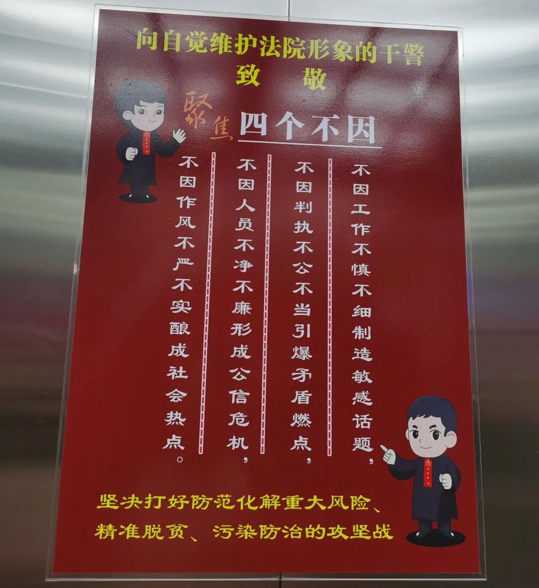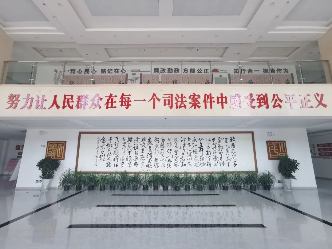 “一墙”。多层次创新文化载体,持续在廊道、电梯内和电梯口等墙面区域下功夫、做文章,提升法院文化软实力。多角度寻求素材,结合法院各业务主题特点,布置各具特色的墙面文化。分别在各楼层墙面悬挂具有法院特色的书画作品,并以此为基础实时动态增加了干警语录文化墙、党风廉政建设文化墙、节约节能文化墙、英模教育文化墙等一系列文化阵地,同时在一楼后门大厅中间大梁墙面上镂刻习近平总书记“让人民群众在每一个司法案件中感受到公平正义”字样,在二楼大厅中间大梁墙面上镂刻“以事实为依据 以法律为准绳”,让干警们在耳濡目染中陶冶情操、增强党性修养。