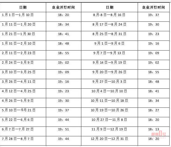 亮灯计划表“‘五一’期间,亮灯时间是19时30分。从6日开始,亮灯时间开始延后,目前亮灯时间是19时44分。”据柳州良业环境技术有限公司的运维经理梁家有介绍,沿江夜景灯光工程每天的亮灯时间不是固定的,根据日照度一年四季的变化,在18时13分到19时51分范围内进行调整。游客若想观赏柳州夜景亮灯时刻,可根据亮灯计划表作为参考做好安排,但亮灯时间还是需要以实际的日照度进行调整。