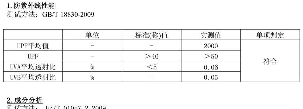注:UPF是英文Ultraviolet Protection Factor的简称,即紫外线防护系数,UPF值为50,就说明有1/50的紫外线可以透过织物。UPF值越高,就说明紫外线的防护效果越好。只有当样品的UPF值大于40,并且UVA的平均透射比小于5%时,才能称之为“防紫外线产品”,这两个条件缺一不可。