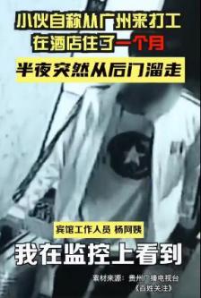 近日在贵阳,一男子自称从广州来打工,在酒店住了一个月,一天半夜突然从后面溜走。据悉,男子共拖欠1320元,电话联系上男子后,他表示有问爸妈借钱,但爸妈没给,有钱了就会立马付房费。酒店方面表示会再等等,若再不偿还将报警处理。(贵州广播电视台《百姓关注》)1米7高大鸵鸟“无证”上路