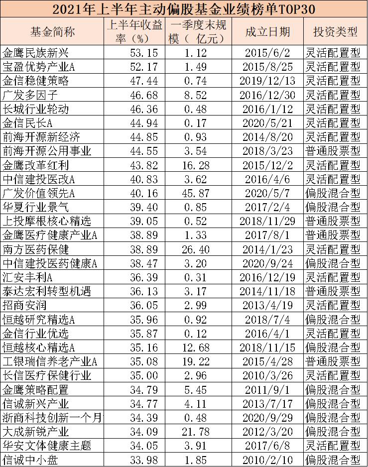 Wind数据显示,截至6月30日,今年以来有57只基金(不同份额的基金只统计A类份额)单位净值涨幅超过30%。从截至一季度末的规模看,这些基金中近8成为规模不到10亿的基金,其中规模不到2亿的小规模基金占据多数份额,达到27只。整体而言,偏股基金业绩30强中,5只基金规模位于10亿至20亿区间,6只基金规模在20亿至50亿区间,仅两只基金规模超50亿元,其余17只规模不足10亿的基金中,大多规模在2亿元左右。