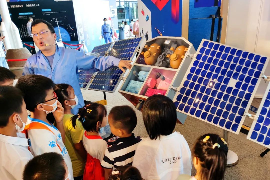 十余件航天实物展品及等比例缩小模型悉数到场,让大小观众过足了瘾。其中有长征二号丁火箭一级发动机尾喷管残骸、启动阀门残骸,还有高达2米9的长征五号运载火箭模型,“玉兔二号”月球车、“祝融号”火星车、鹊桥中继卫星、天宫二号与神舟十一号交会对接空间站等,助力中国科技强国梦,让观众对中国载人航天及深空探索有了进一步的认识。