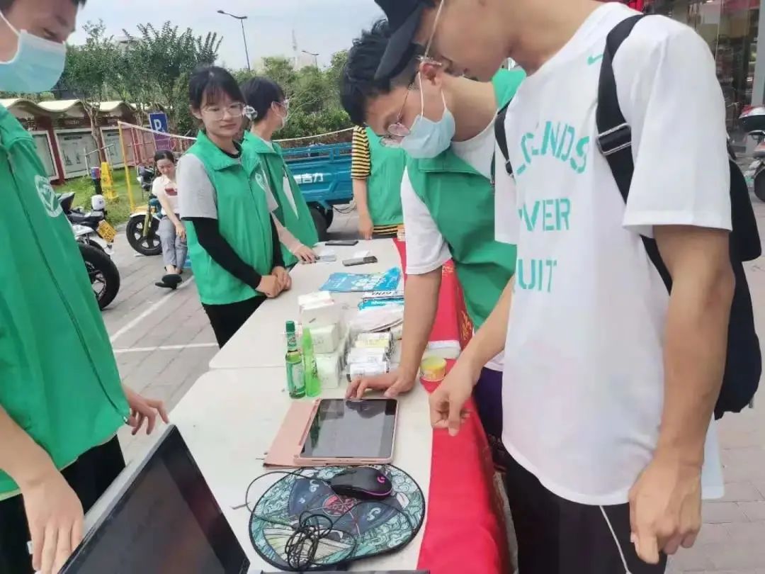 在负责人的带领之下,队员们来到居委会摆放节能减排答题用具(本次采用纸质问题卷和电子版两种模式)以及奖品。一切准备就绪,队员们披上绿马甲,纷纷投入宣传工作。虽然天气闷热,但是每个人都尽力向社区居民们传达节能减排知识。汗水浸湿衣衫,每个人的头发下面都流淌着亮晶晶的汗珠。在此过程中,队员们积极与社区居民进行交流,选取一些极具教育意义的问题,让社区居民认识到了在日常生活中如何做到节能低碳。