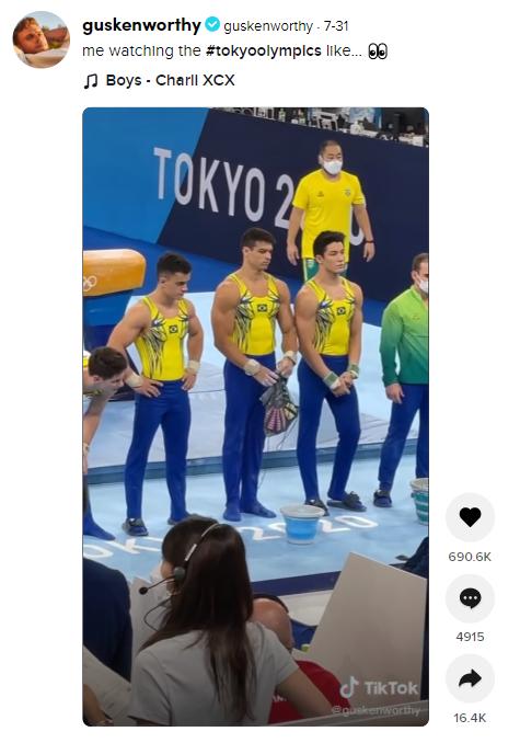 自由式滑雪运动员盖斯‧柯沃西(Gus Kenworthy)来东京做赛事评论员,他剪辑了一条体操赛场上性感男运动员的短视频。02